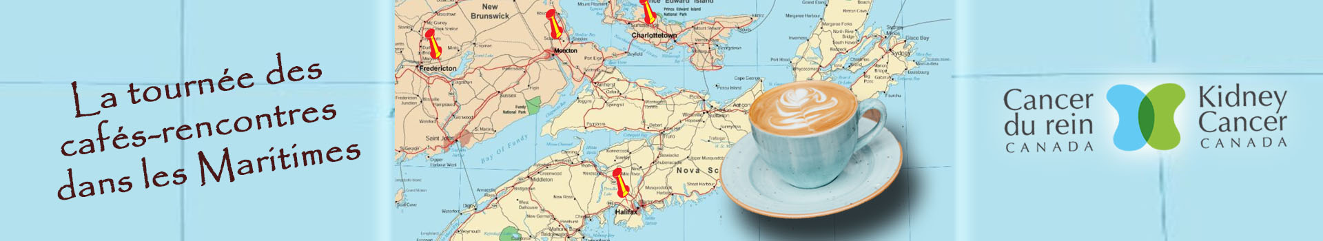 Cancer du rein Canada part en tournée pour rencontrer des médecins et des professionnels de la santé à l’occasion du congrès annuel de l’Association des urologues du Canada (AUC). En cours de route, nous sommes ravis d’organiser des cafés-rencontres à divers arrêts dans les provinces maritimes.